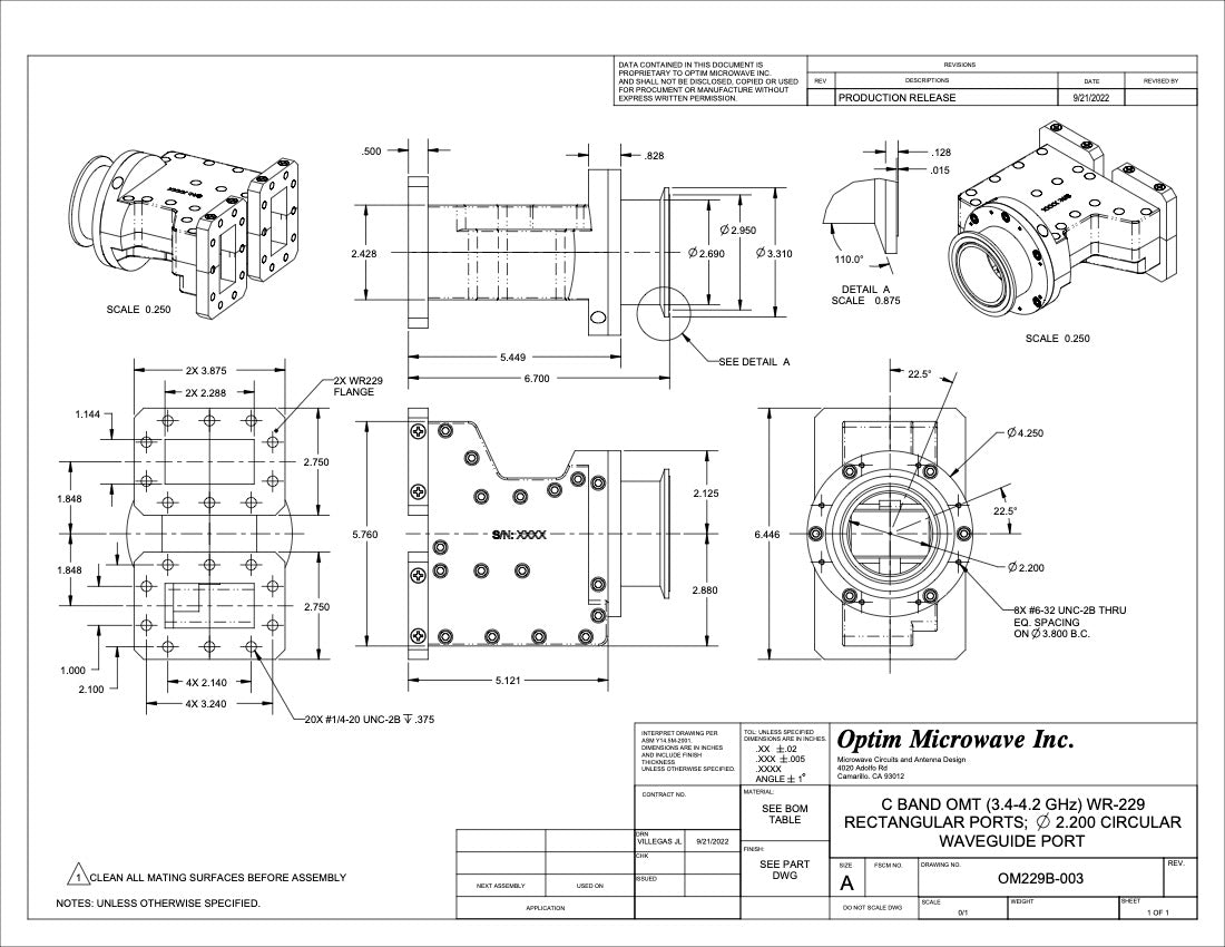 C Band OMT WR229 Rectangular Ports; 2.104" Dia Circular Common Port 3.4-4.2 GHz (OM229B-003)