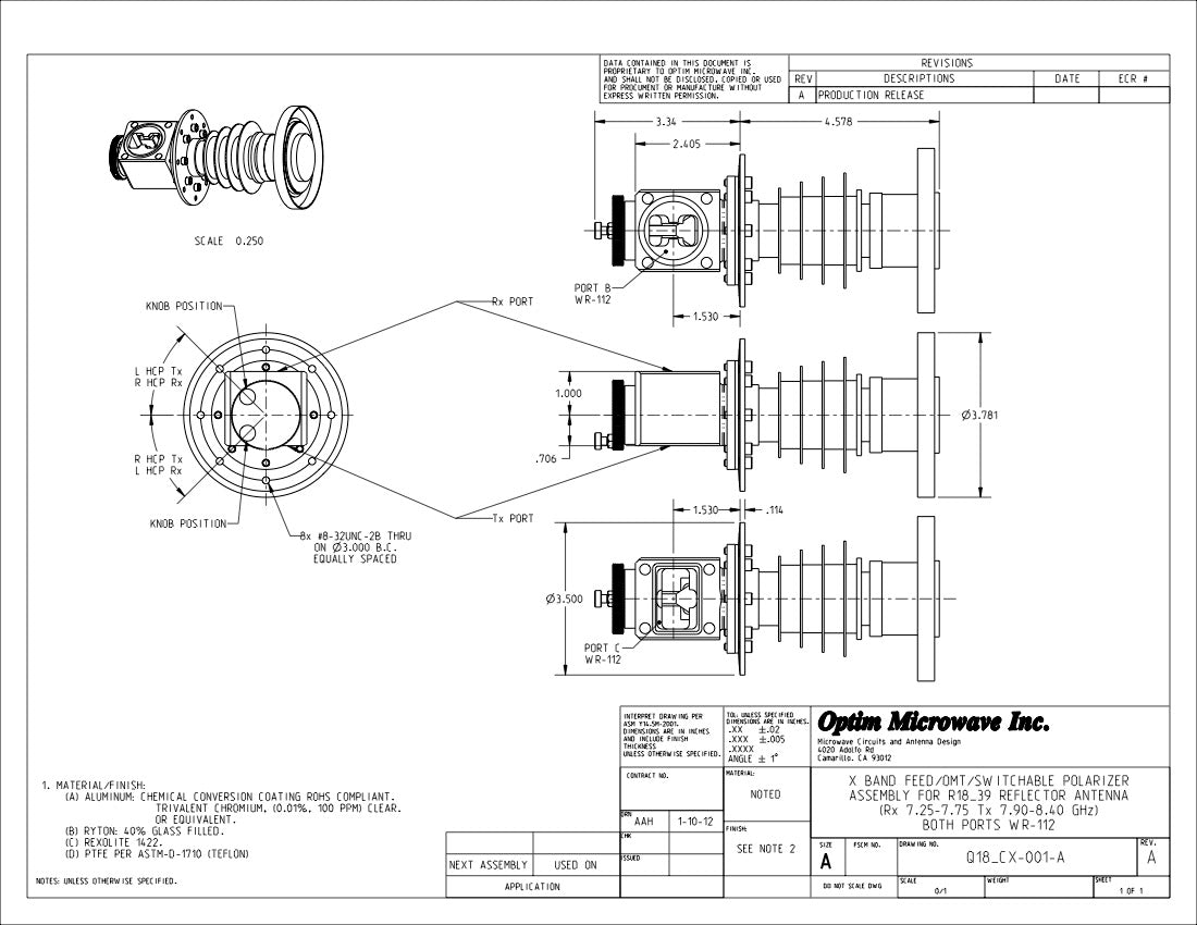 X-Band Feed/OMT/Rotating Polarizer for a 18" or 45cm Reflector Rx: 7.25-7.75 GHz; Tx: 7.9-8.4 GHz (Q18_CX-001)