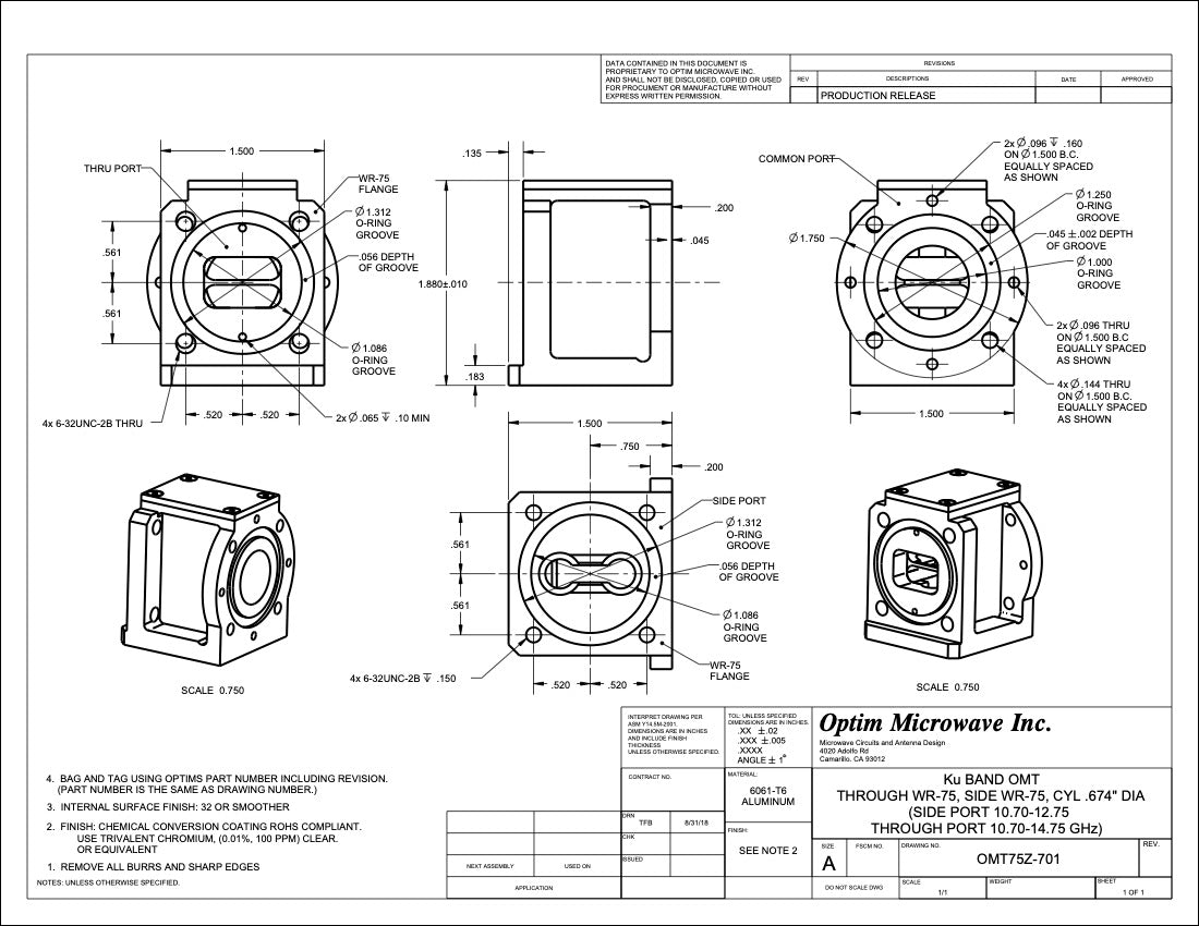 Ku Band Tx/Rx OMT with O rings; Through WR-75, Side WR-75, Cyl. .674" Dia Side Port 10.70-12.75 Through Port 10.70-14.75 GHz (OMT75Z-701)