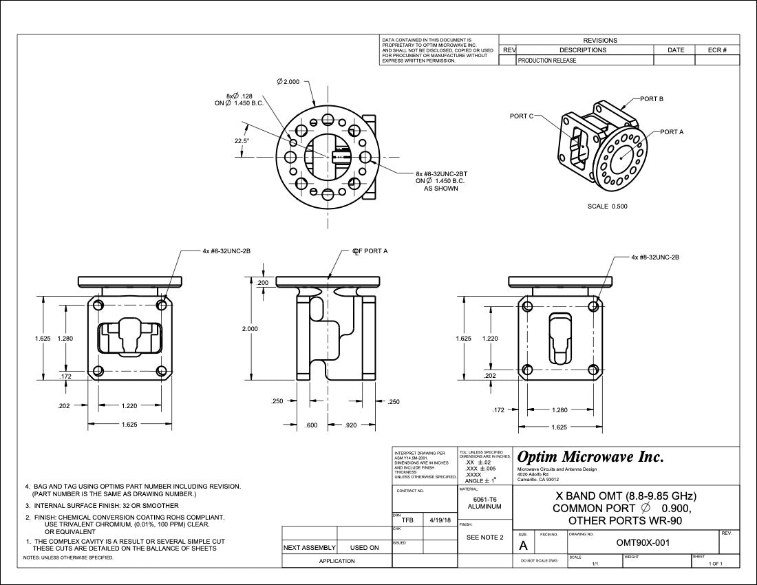X Band OMT with Tx/Rx Ports WR90 and Common Port 0.900" Diameter Circular 8.80-9.85 GHz (OMT90X-001)