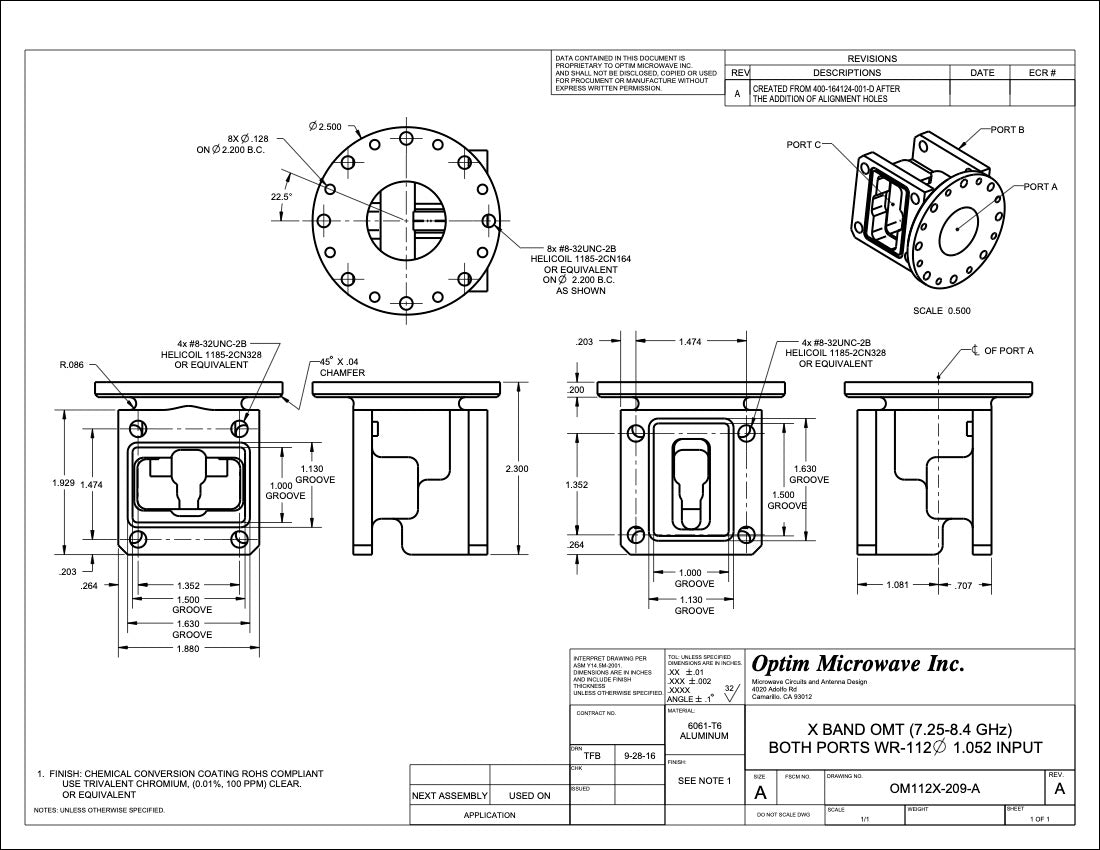 X-Band OMT Both Ports WR-112, 1.052" Input (7.25-8.40 GHz) Shortened Length